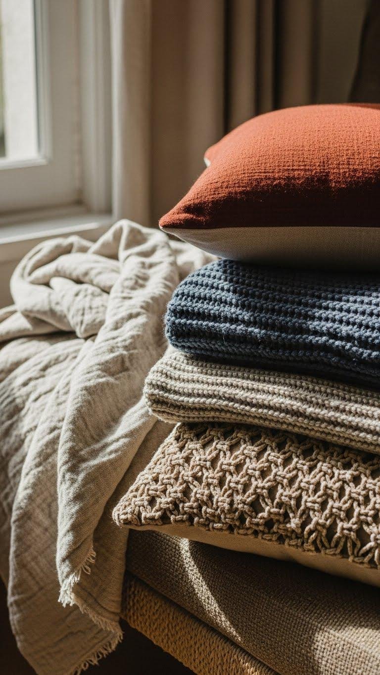 Mix natural-fiber throws and pillows to build depth and tactile interest without overwhelming the space. Layer a linen slub throw, a wool-knit blanket, and hemp macramé cushions for contrast in weight and weave. You’ll mix muted tones and one bold accent, rotate textures seasonally, and keep arrangements casual. This approach feels effortless, free, and inviting while staying refined.