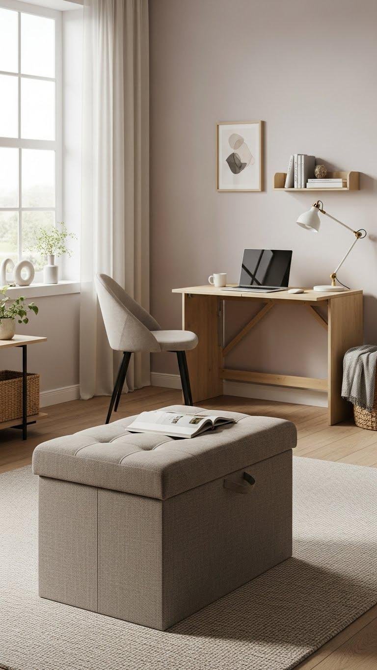 Think about furniture that pulls double duty so every piece earns its place. Choose storage ottomans for hidden clutter and extra seating, and place a foldable desk where it tucks away when you crave open space. You’ll create a flexible, calm room that adapts to work, rest, or company — stylish, efficient solutions that give you freedom without sacrificing form.