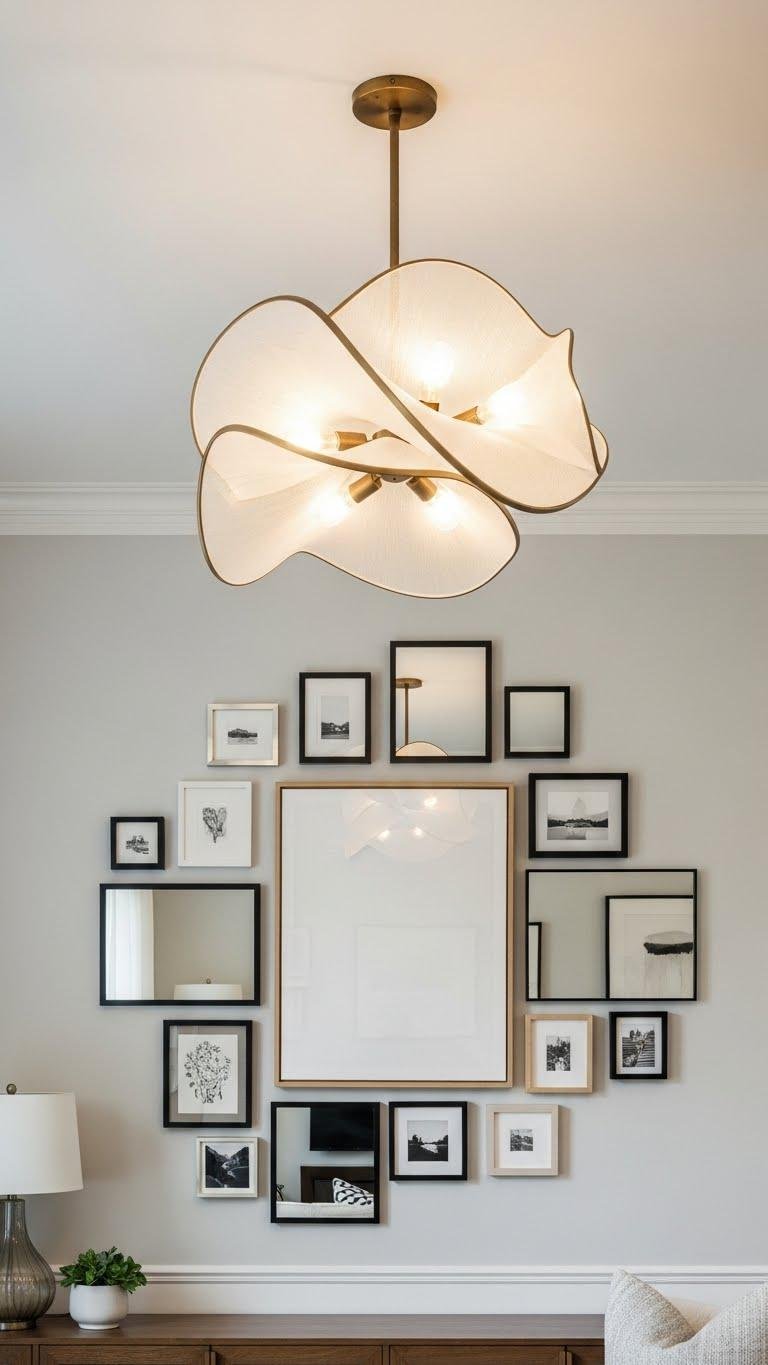 After your sculptural pendant sets the room’s tone, let art and mirrors reinforce that identity by forming intentional clusters on adjacent walls.