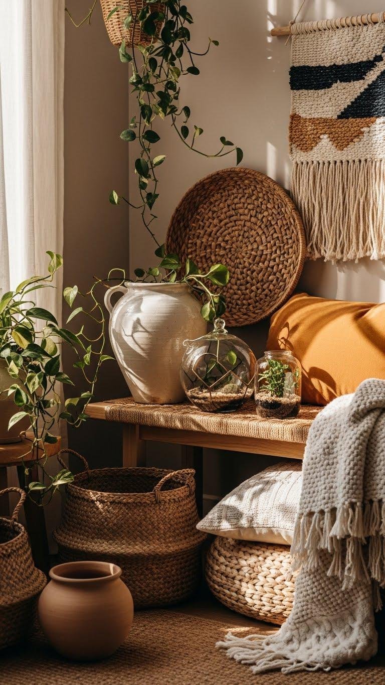 Add sculptural pots, trailing vines, and compact indoor terrariums to bring life without clutter. Pair them with woven wallhangings, rattan baskets, and textured throws to create breathable, relaxed layers. Choose pieces that move with you and reflect a liberated, personal aesthetic.