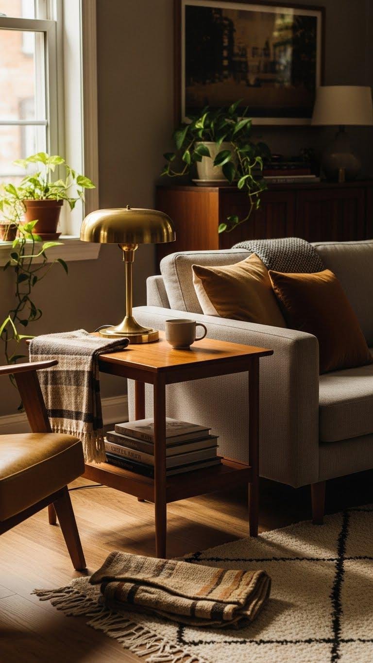 Let lighting set the mood, then let your furniture tell the story: pairing a few well-chosen vintage pieces with clean modern basics gives a room that collected, layered look without feeling cluttered.