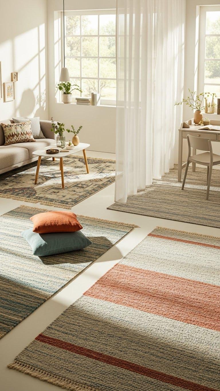Use layered rugs to anchor seating and a workspace, mixing texture and scale.