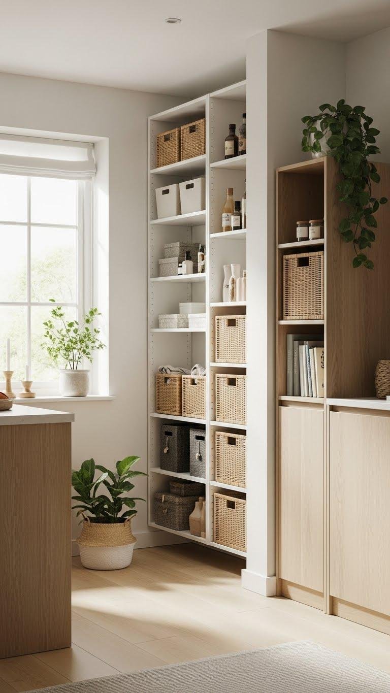 Those layered throws and pillows create a calm, textured surface—but to keep that look feeling airy, you’ll want storage that disappears into the room. Install hidden cabinets and recessed shelving to tuck items away without visual weight. Choose flush doors, soft-close hardware, and a continuous finish so belongings vanish.