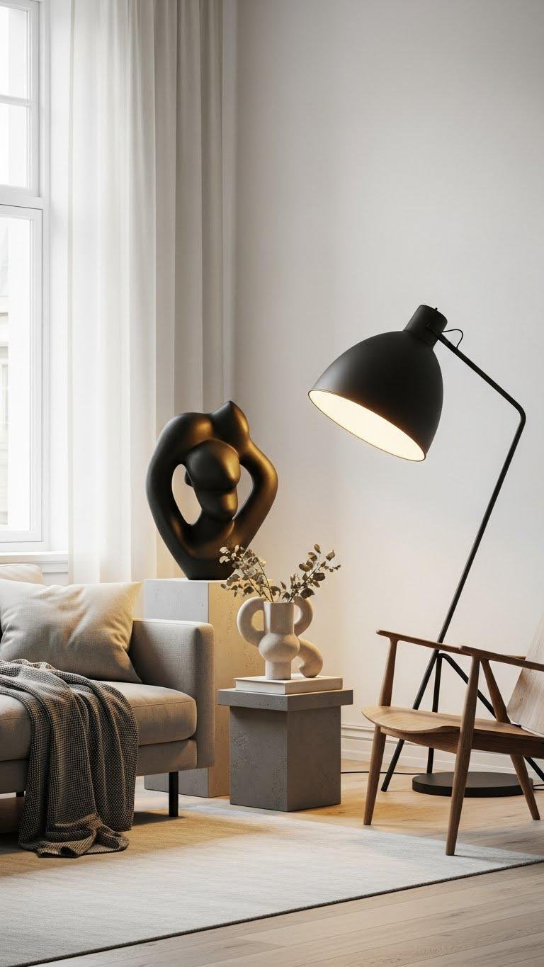 You’ll create statement anchors that draw the eye and allow curated negatives to breathe. Let each piece earn its place—bold sculpture, a large lamp, an iconic chair—so your room feels open, intentional, and free.