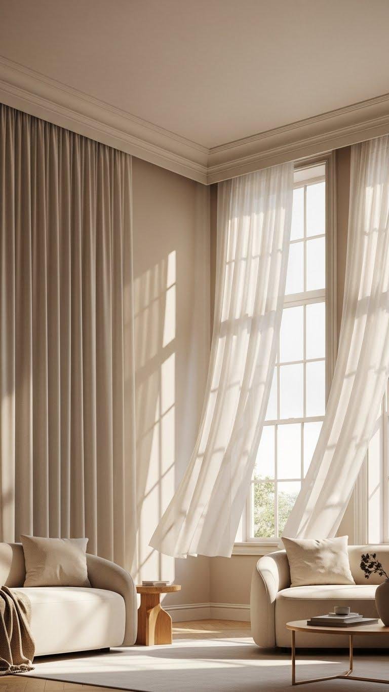 Curved silhouettes soften sightlines, and you can amplify that openness vertically with floor-to-ceiling drapery that visually lifts the room. Hang panels close to the cornice to trick the eye into greater ceil height, choose a minimally intrusive rod selection for clean lines, and let lightweight fabrics float. You’ll create airy drama without clutter, freeing the space and your mind.