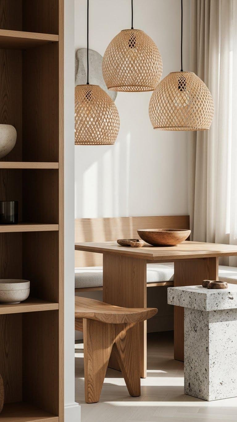 Mix rattan lighting for soft shadows, warm wood accents for tactile grounding, and stone countertops or a sculptural side table for permanence. Keep palettes minimal and let textures speak, so your space feels open and free.