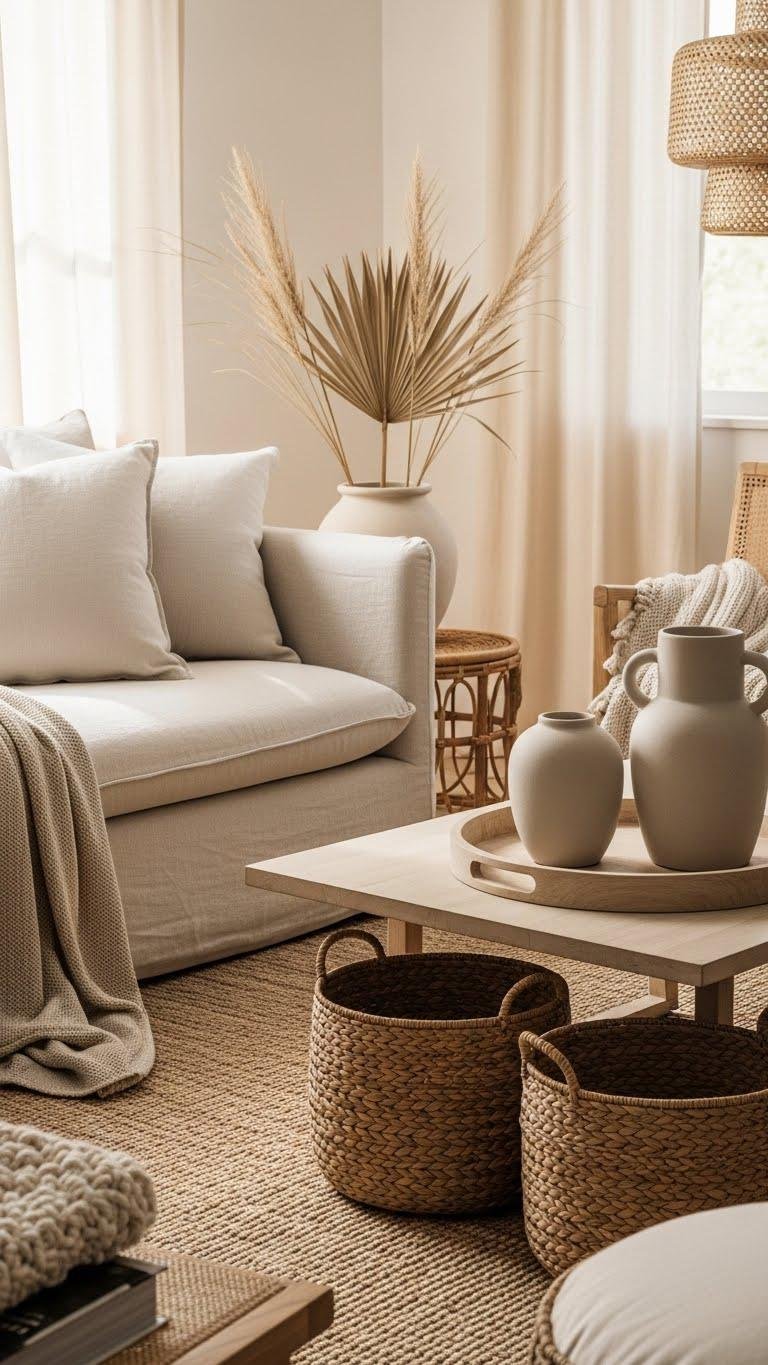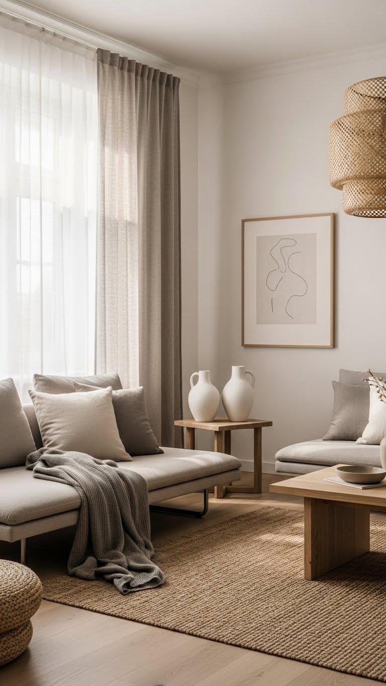 Start with a simple base of warm whites, soft grays, and taupes so your room feels calm and cohesive. You’ll anchor spaces with tonal neutrals, then add interest through layered textures—linen drapes, woven rugs, matte ceramics.