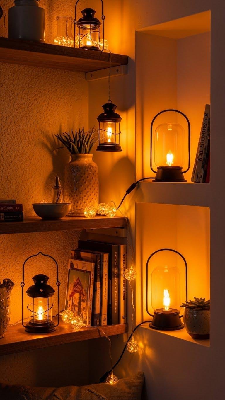 Bring in soft pools of light with plug-in or battery-operated accent lighting to shape mood without rewiring. You can drape plug in fairylights along shelves, tuck battery lanterns into nooks, or place dimmable plugs for evening ease. Choose warm tones, simple fixtures, and portable options so you can rearrange freely, highlight textures, and switch atmospheres instantly without commitment.
