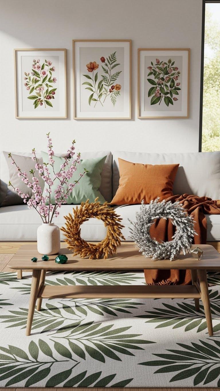 Botanical motifs anchor your space with timeless calm, and you can refresh them each season with a few deliberate accents. Keep botanical silhouettes in cushions, art, and rugs as a steady backdrop.