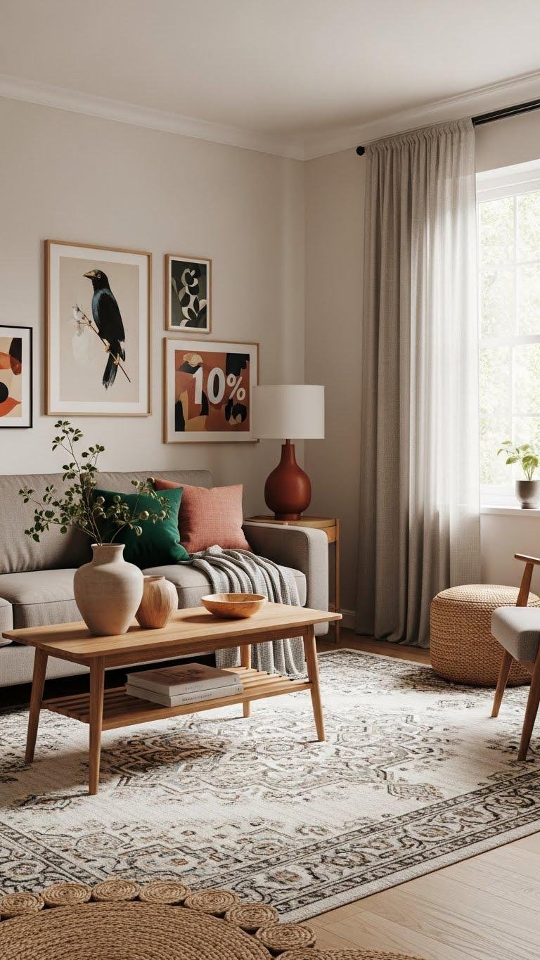 After grounding a room in natural textures, you’ll want a simple color framework to keep the look cohesive—apply the 60-30-10 rule: 60% is your dominant field (walls, large rugs, major furniture), 30% is the secondary layer (sofas, curtains, area rugs), and 10% is the accent (pillows, vases, artwork).