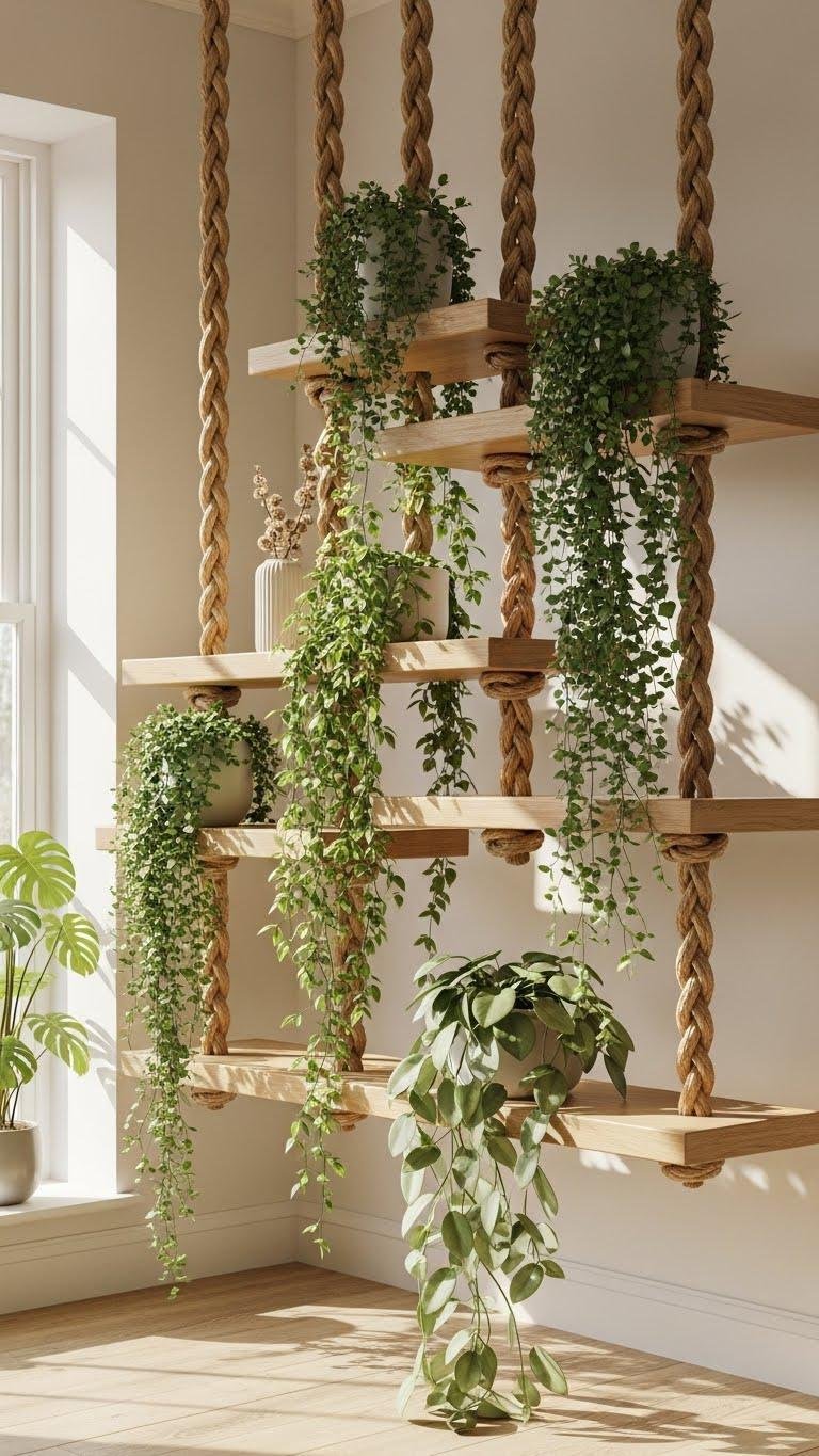 Hanging Rope Shelves Styled With Cascading Plants