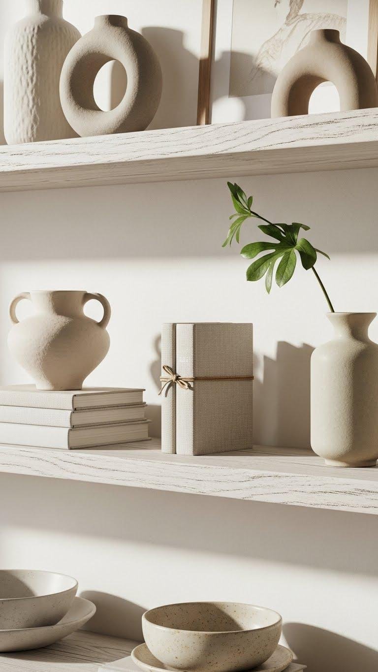 A single sculptural vase or a bold ceramic plate can become the hero of a clean-line shelf, so place it with intentional breathing room and let the form speak.