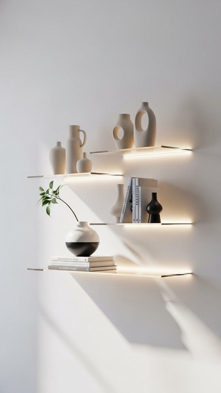 Float slim acrylic shelves on your wall to let a curated edit take center stage — the clear planes read almost invisible, so your objects seem to hover in space and the eye lands only on shape, color, and line. You’ll rely on invisible brackets and subtle edge lighting to define silhouettes, keeping displays spare, confident, and effortlessly mobile so you can rearrange at will.