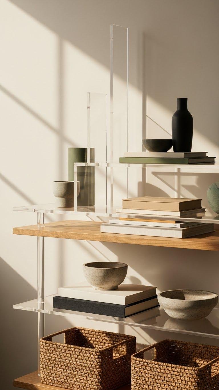 If the clear planes of acrylic shelves let single objects sing, multi-level shelving asks you to choreograph a small, layered scene — mixing heights, materials, and textures to create rhythm and depth.
