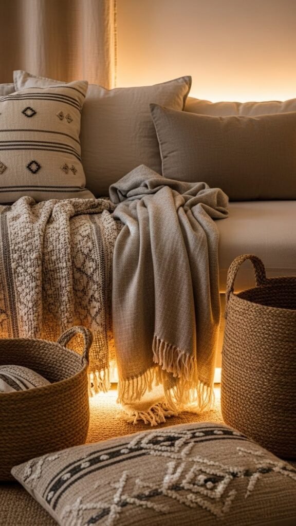 Once the glow from your hidden LEDs defines shapes, soften those edges with natural fibers and cozy throws that add tactile contrast and warmth.