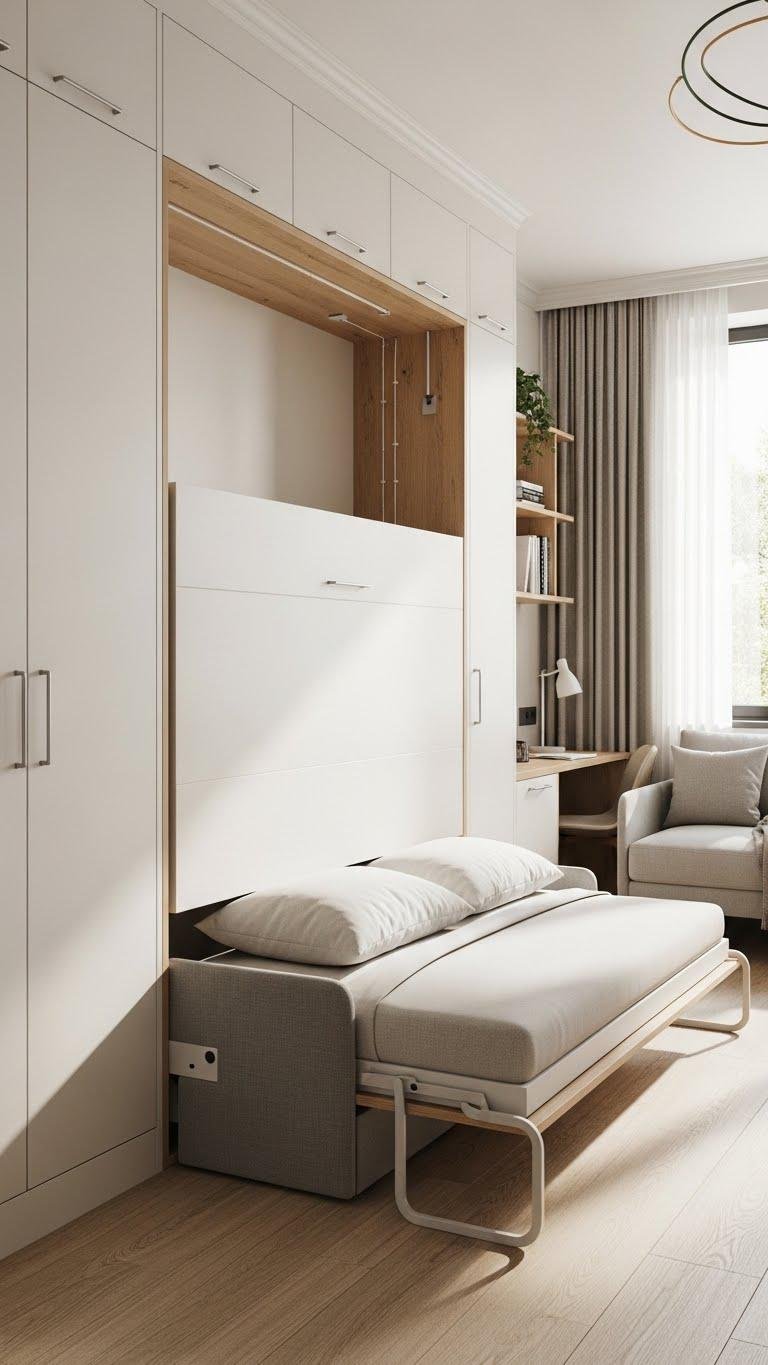If you’re tight on floor area, a Murphy bed turns sleeping space into living space in seconds—fold it up against the wall to reveal a sofa, desk, or open floor for workouts and guests.