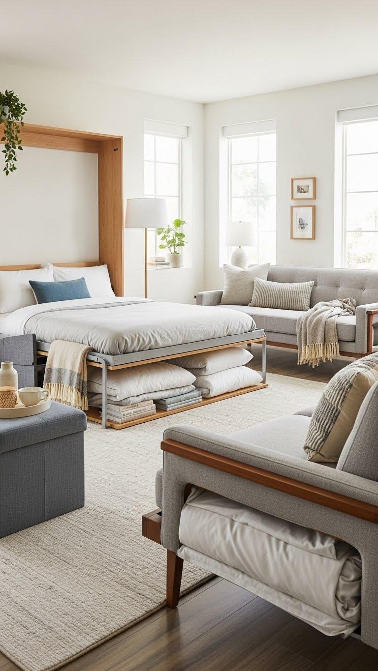 Once you fold up the bed and free the floor, think about seating that works harder—sofas with built-in storage keep blankets, books, and spare linens tucked away without cluttering your studio.