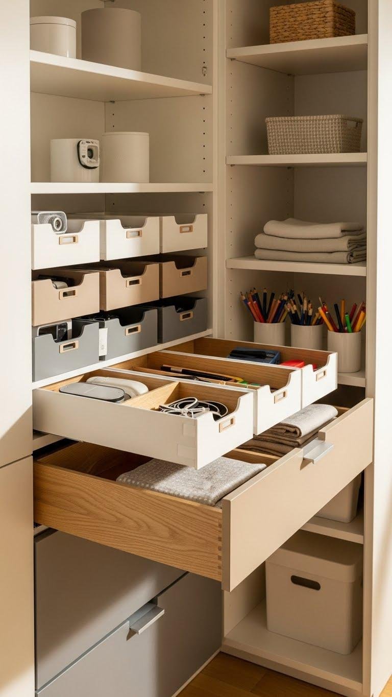 After fitting custom built-ins into that awkward nook, keep everything usable by adding multi-compartment organizers and drawer dividers that mirror the room’s clean lines. You’ll love how modular inserts let you swap zones for gadgets, art supplies, or linens. Use subtle drawer labels for instant calm; clear, consistent compartments free your mind and keep small spaces feeling open, curated, and effortlessly stylish.
