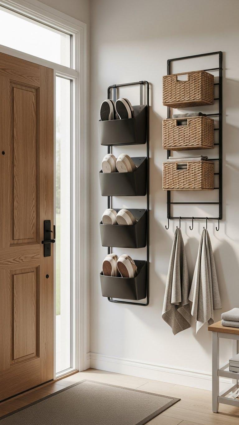 Hang a shoe caddy behind entry doors, stack baskets on slim rails, and install minimalist towel hooks for quick-dry convenience. Choose matte metal or warm wood finishes to stay modern while keeping your home open and liberated.
