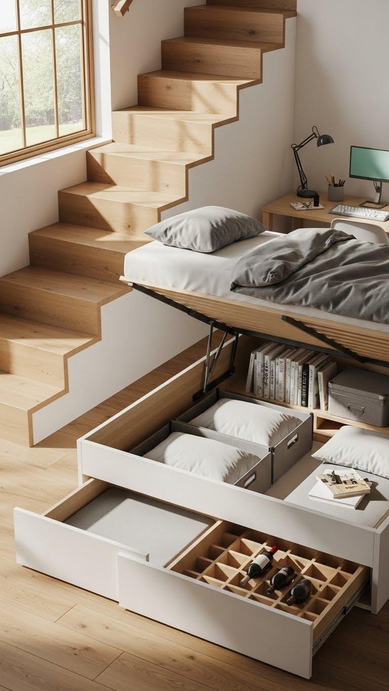 You’ll love clever solutions: under stair wine racks, drawered treads, or a lift up platform bed that stashes linens, gear, or a hobby station.