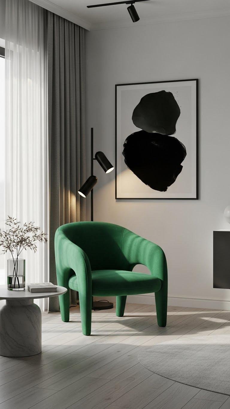 Choose a single bold accent and let everything else recede — one vibrant chair, a sculptural lamp, or a dramatic piece of art can anchor the room without cluttering it. You’ll commit to a single statement focal point, pairing it with a restrained monochrome scheme elsewhere so the accent breathes. This keeps your small space confident, uncluttered, and effortlessly free.
