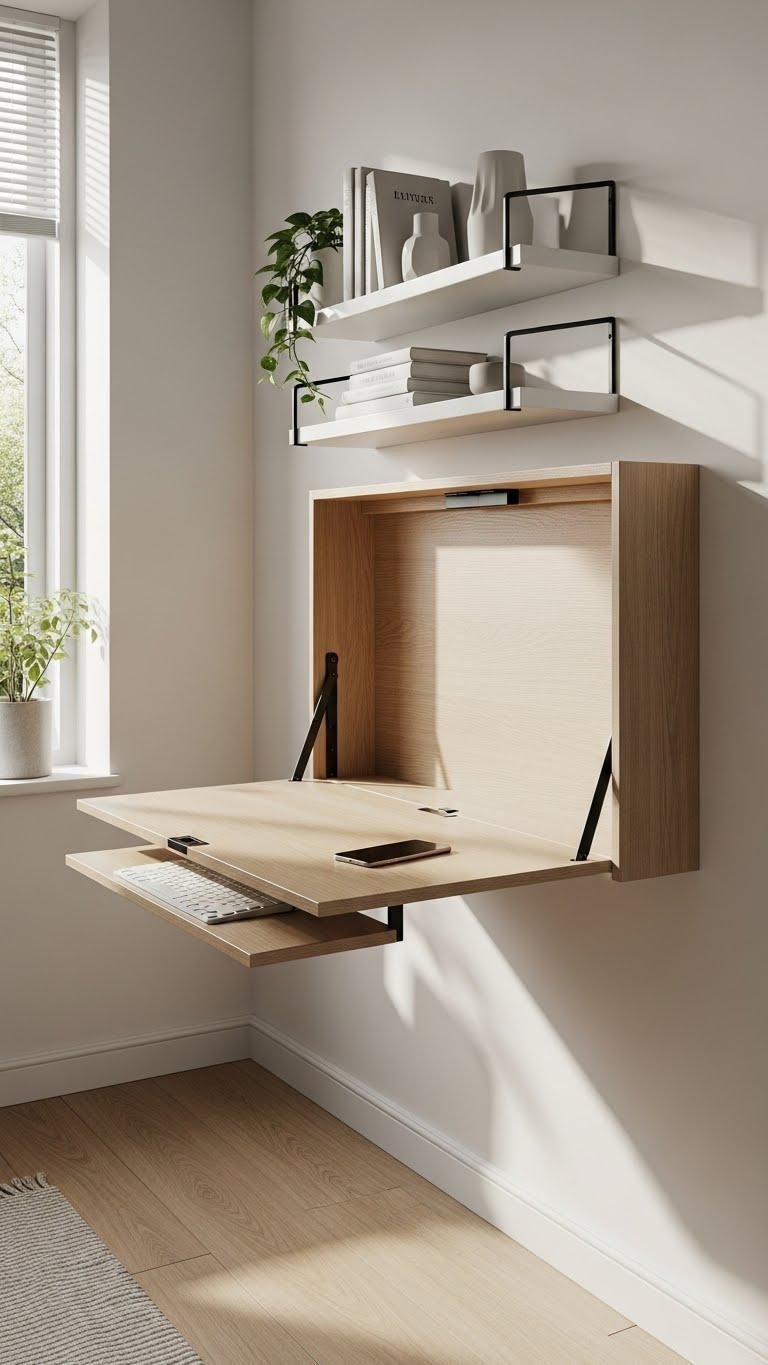 Maximize your walls by installing a sleek fold-down desk that transforms a narrow strip into a focused work zone in seconds.