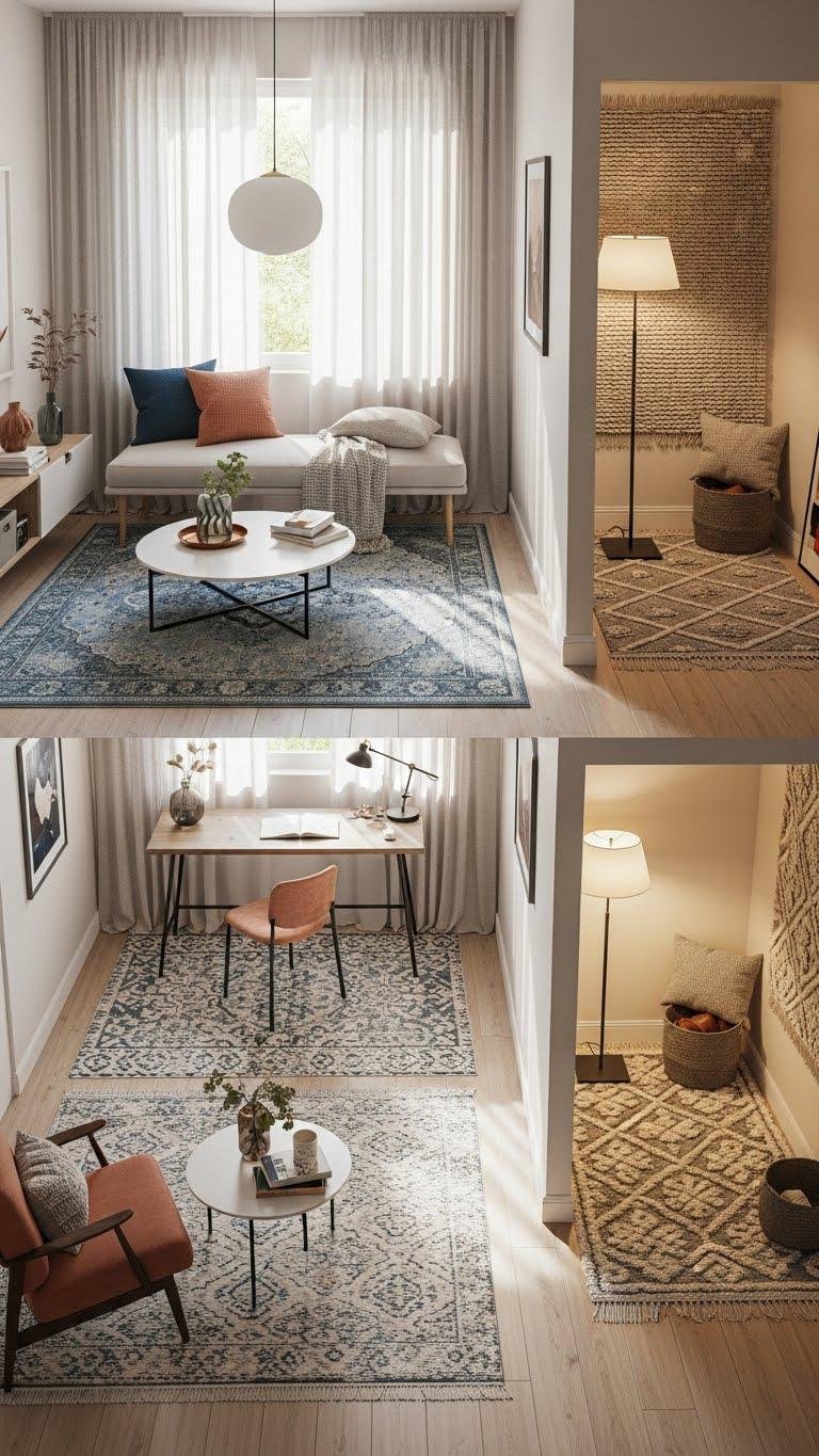 If you want a small room to read as separate areas, anchor each zone with a rug that’s properly scaled to the furniture it serves. You’ll create clear color zoning and use pattern layering to add depth without clutter. Choose rugs that let you float seating, define a workspace, or highlight a nook. That freedom keeps the layout airy and intentional.