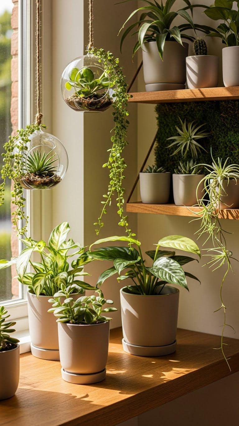 You’ll pick slim ceramic pots, hanging glass globes, or a shelf of air purifying succulents to boost mood and air. Try a miniature moss wall for texture—easy, low-maintenance, and freeing.