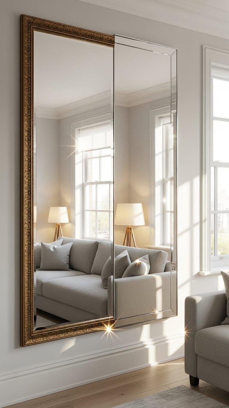 Hang a large mirror to bounce light around the room and instantly make the space feel bigger. Choose an antique frame for character or a sleek modern one for calm; both amplify light.