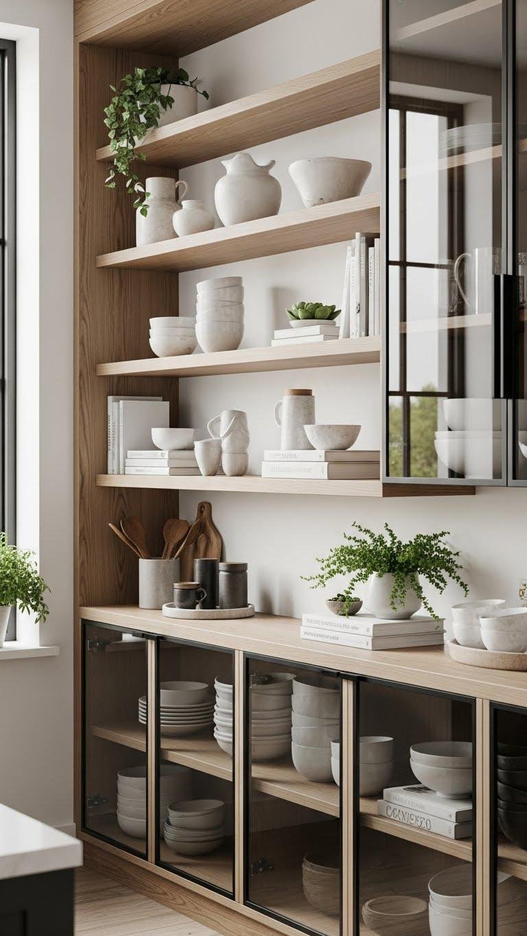 Open shelving and glass-front cabinets pull a room together without closing it off, giving you display space that feels airy rather than boxed in.