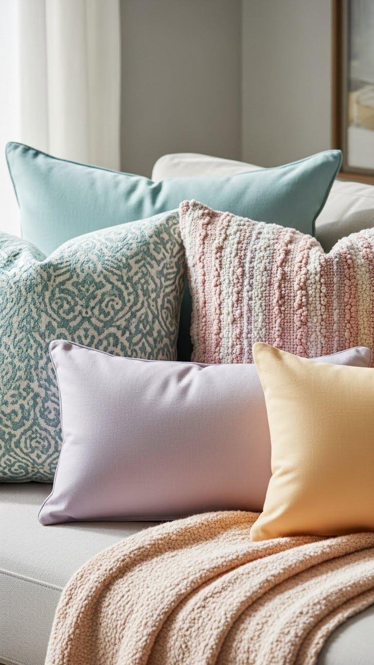 Layer a mix of pastel throw pillows to instantly freshen your sofa and add subtle color without overwhelming the room. You’ll combine varying pastel texture—linen, boucle, soft cotton—to create depth and a relaxed vibe. Keep pillow arrangement casual: two larger anchors, one patterned, one solid, plus a small accent. It reads effortless, modern, and invites you to lounge freely.