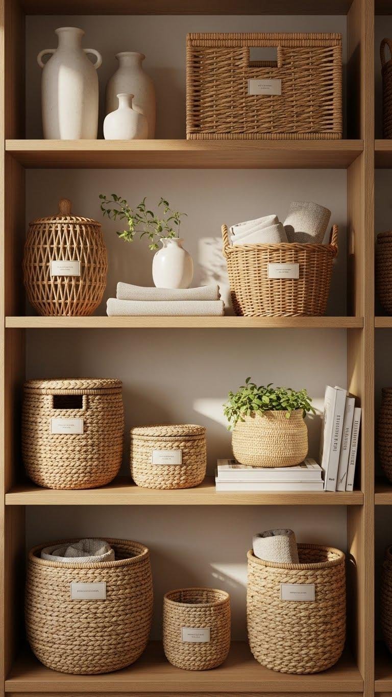 You’ll mix wicker styling with varied textures, balance basket sizing across shelves, and leave negative space so items breathe.