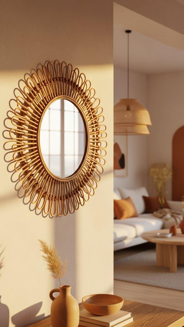 Warm up a plain wall by hanging a rattan mirror—its organic weave adds instant texture and a relaxed, on-trend vibe without overpowering the space. Choose mirror placement that reflects light and sightlines, creating openness. You’ll keep it airy by following simple rattan care—dust gently and avoid moisture. Let that natural frame anchor your room, feel free to mix relaxed shapes and clean lines.