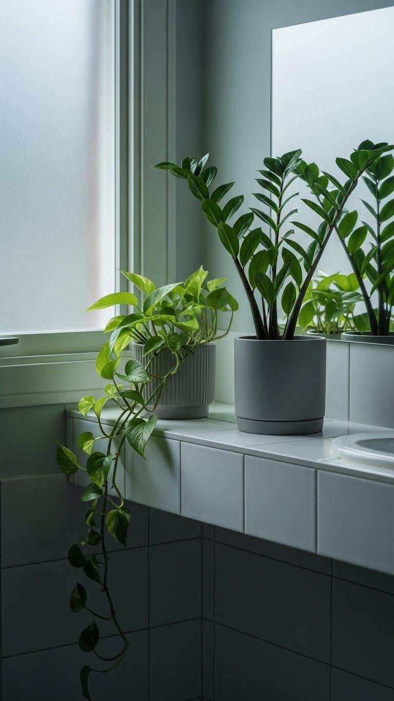 Bring a pothos or ZZ plant into your bathroom to introduce low‑light, low‑maintenance greenery that looks fresh all spring. You’ll enjoy resilient low light foliage that breathes life into tile and mirrors.