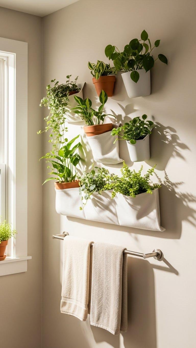 Tucked into an empty wall or above the towel rack, a vertical plant display saves floor space while turning greenery into a focal point.