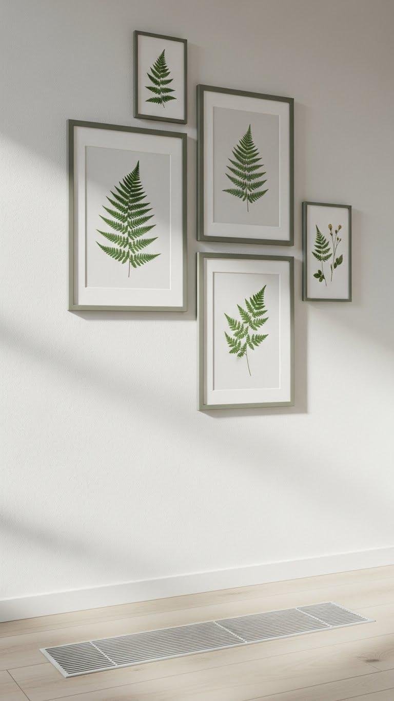 After you’ve warmed the room with underfloor heat or a heated towel rack, bring life to a small wall with framed botanical prints that keep the scheme light and modern. You’ll create a calm, airy focus by mixing framed fernlets and a mini herbarium in slim, matte frames. Arrange them asymmetrically for movement, pick muted greens, and leave breathing space around each piece.
