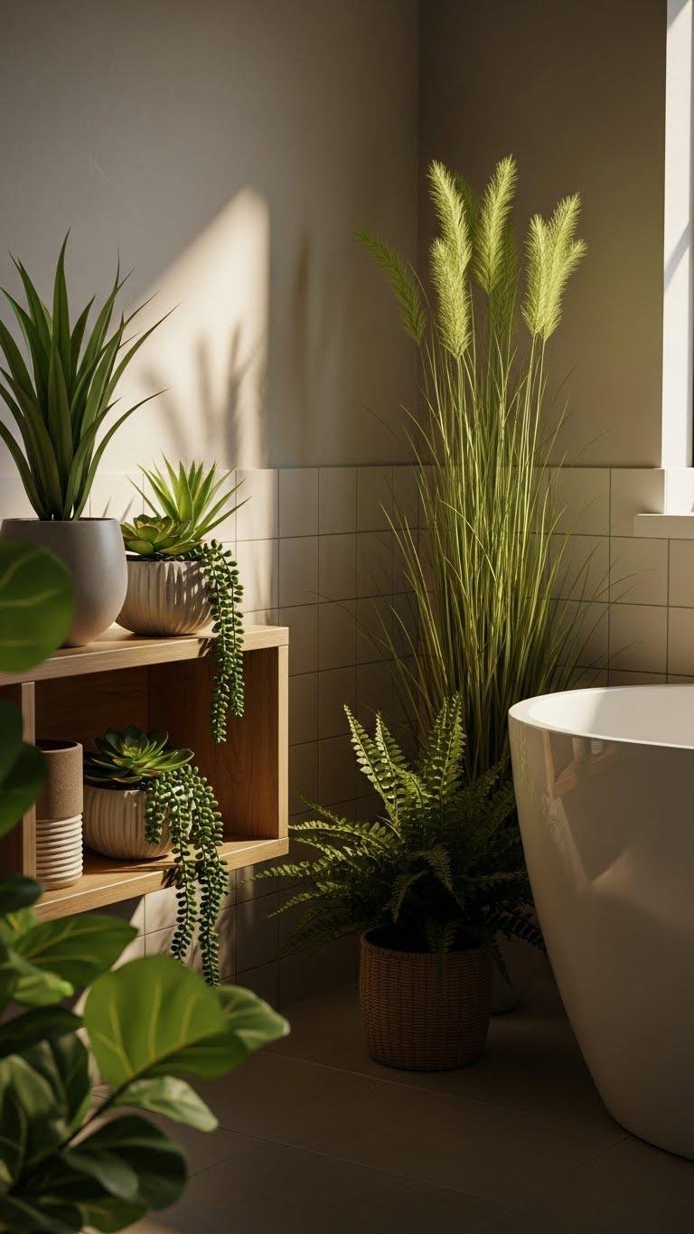 You’ll love arranging silk succulents on open shelves, tucking faux fernpots beside a freestanding tub, or clustering tall grasses to add vertical calm.