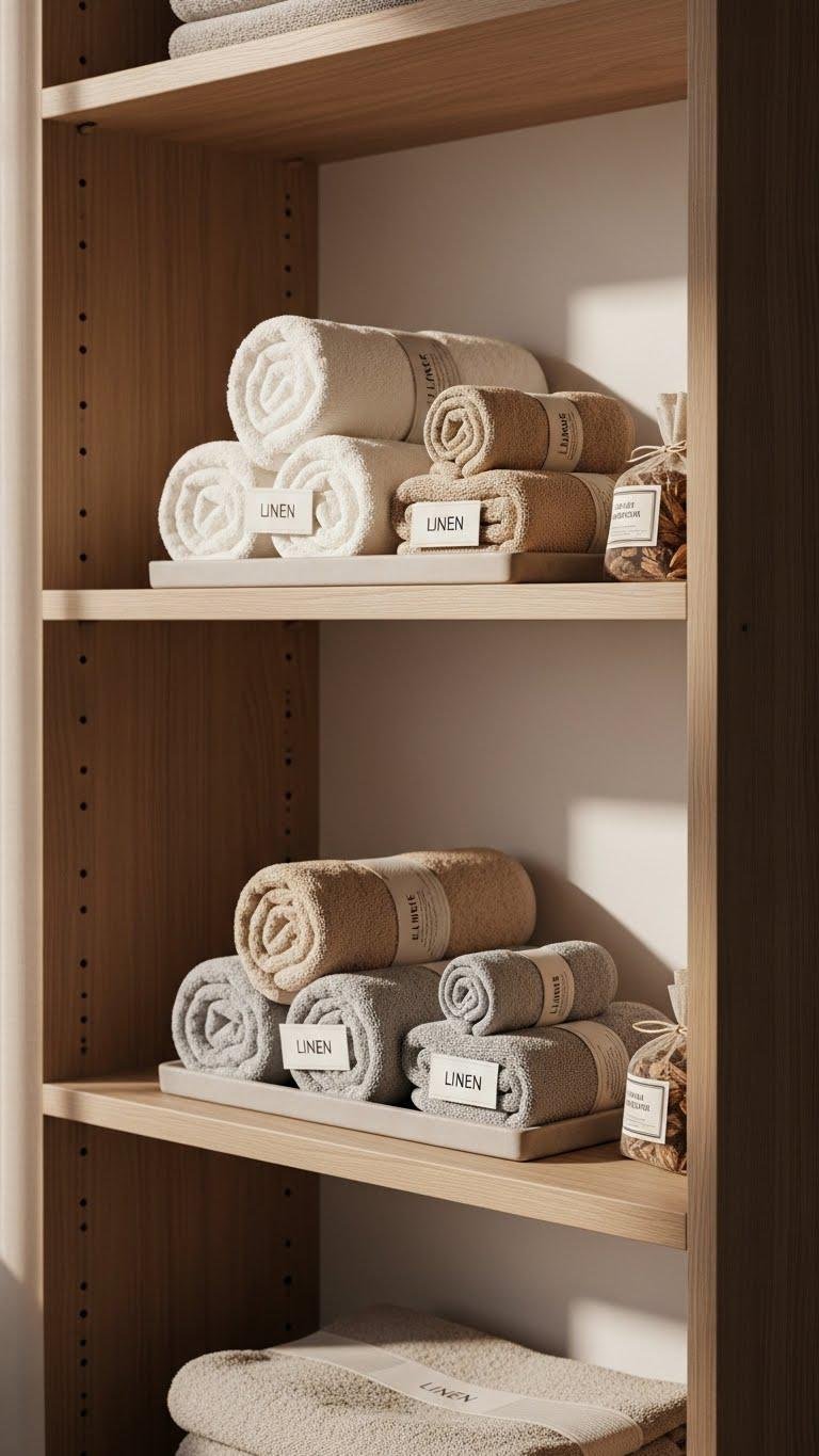 Arrange neutrals, add linen labels for effortless order, and tuck scented sachets into corners.