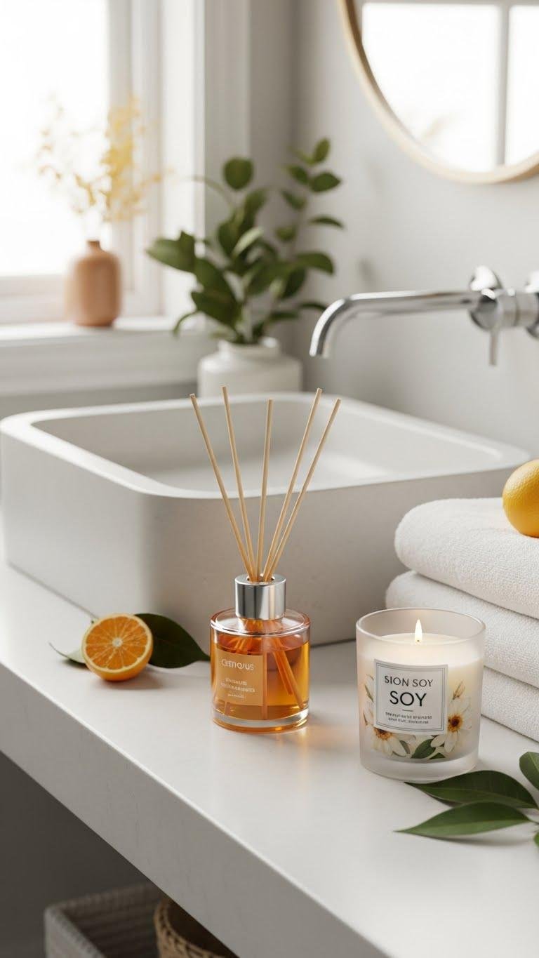 Bring in a diffuser or scented candle to lift the whole room — citrus and floral notes read fresh and modern, instantly turning your bathroom into a spa-like retreat. Place a citrus reed diffuser by the sink and a floral soy candle near towels to create layered scent pockets.