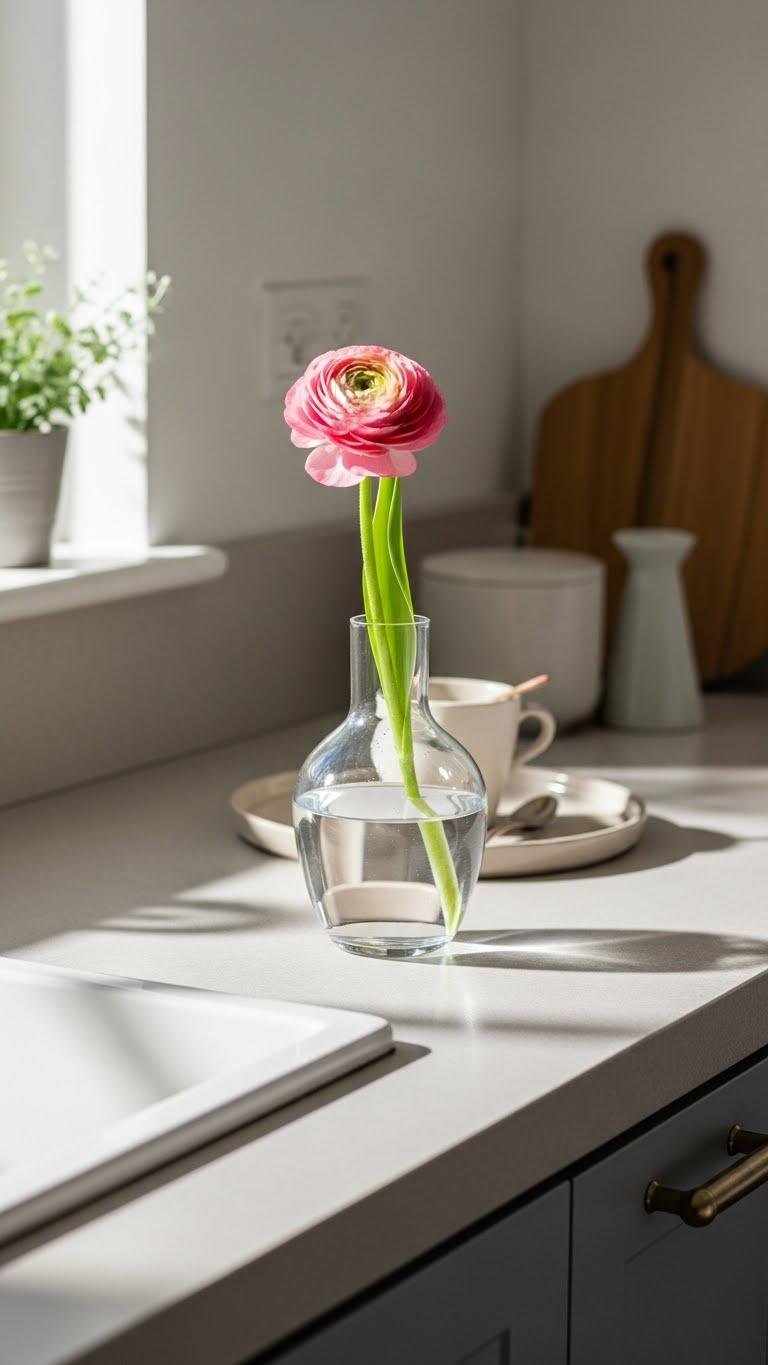If vertical plants save floor space and add texture, single‑stem vases sharpen the counter with a quieter, sculptural note.
