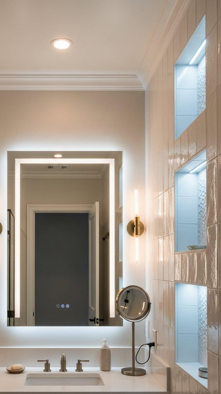 Lighting does more than illuminate—it sculpts the space and sets the mood, so after layering scent, think about layering light. You’ll combine ambient ceiling washes, task vanities for grooming, and accent LEDs to highlight texture.