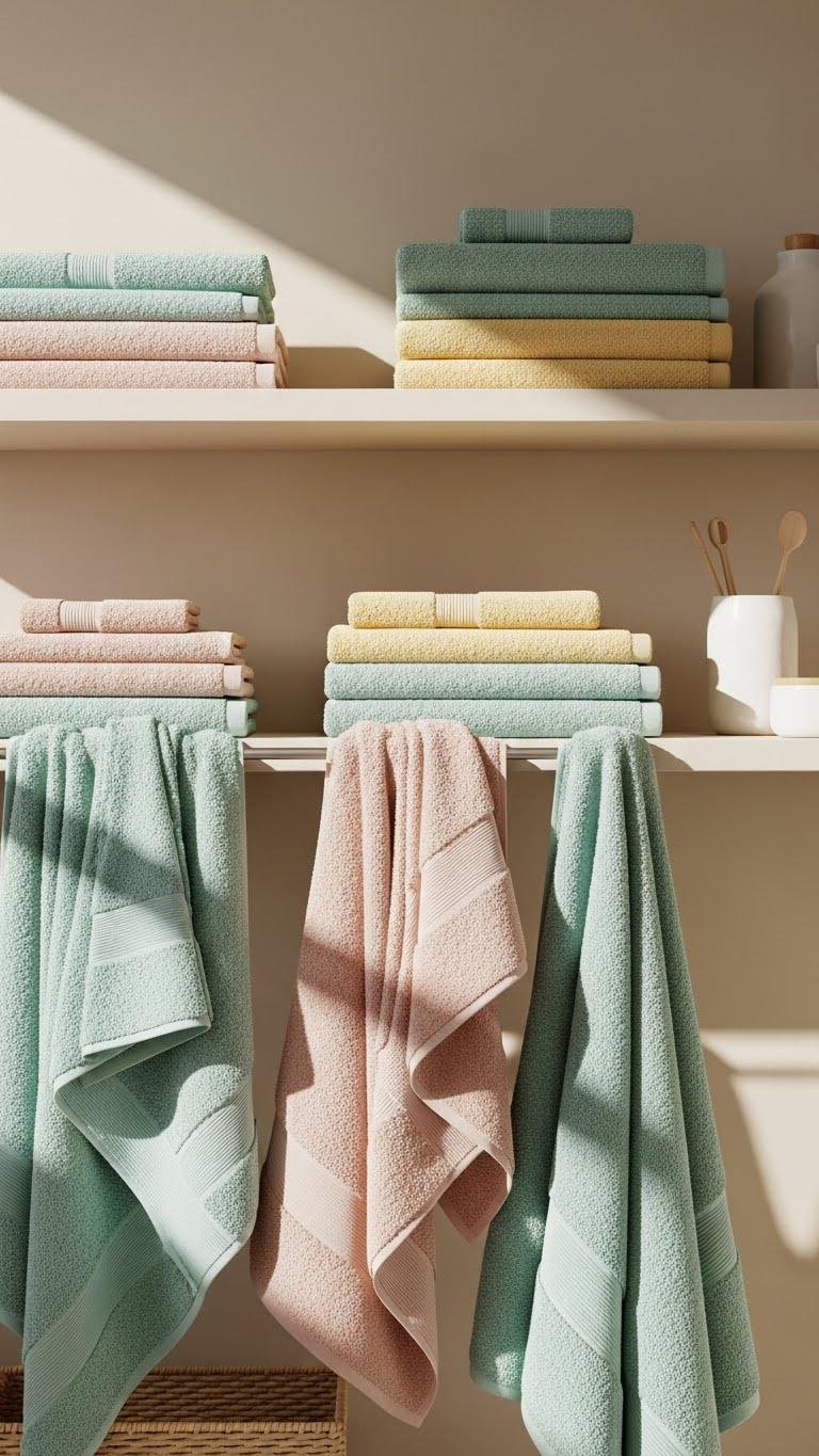 Swap out heavy, dark towels for soft pastel sets to instantly lighten the room and echo spring’s gentle palette. You’ll mix muted mint, blush, and butter hues for subtle color blocking that feels modern, calm, and free.