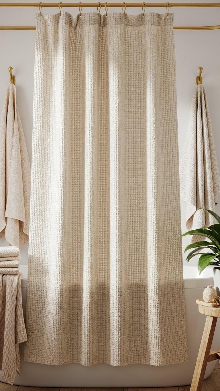 Once your pastel towels set the tone, bring that soft, textured look to the shower with a waffle‑weave cotton curtain. You’ll love the textured softness underfoot and sightlines that feel airy, not fussy.