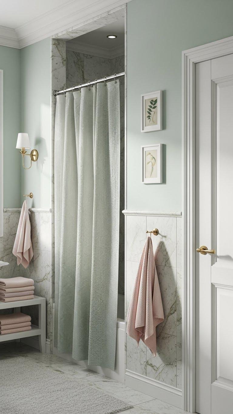 A light green‑gray on the walls gives your bathroom an airy, modern calm that pairs beautifully with the waffle‑weave curtain and pastel towels. Choose a shade with subtle sage undertones to feel grounded without heaviness.