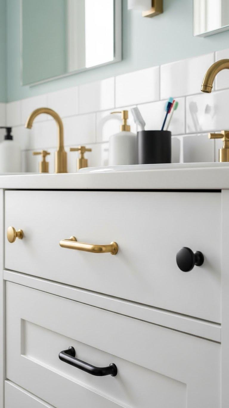 When you swap out tired knobs and pulls for brushed brass or matte black, the whole bathroom reads fresher and more intentional. You’ll create polished contrast against white tile and soft pastels, anchoring the room without weight.