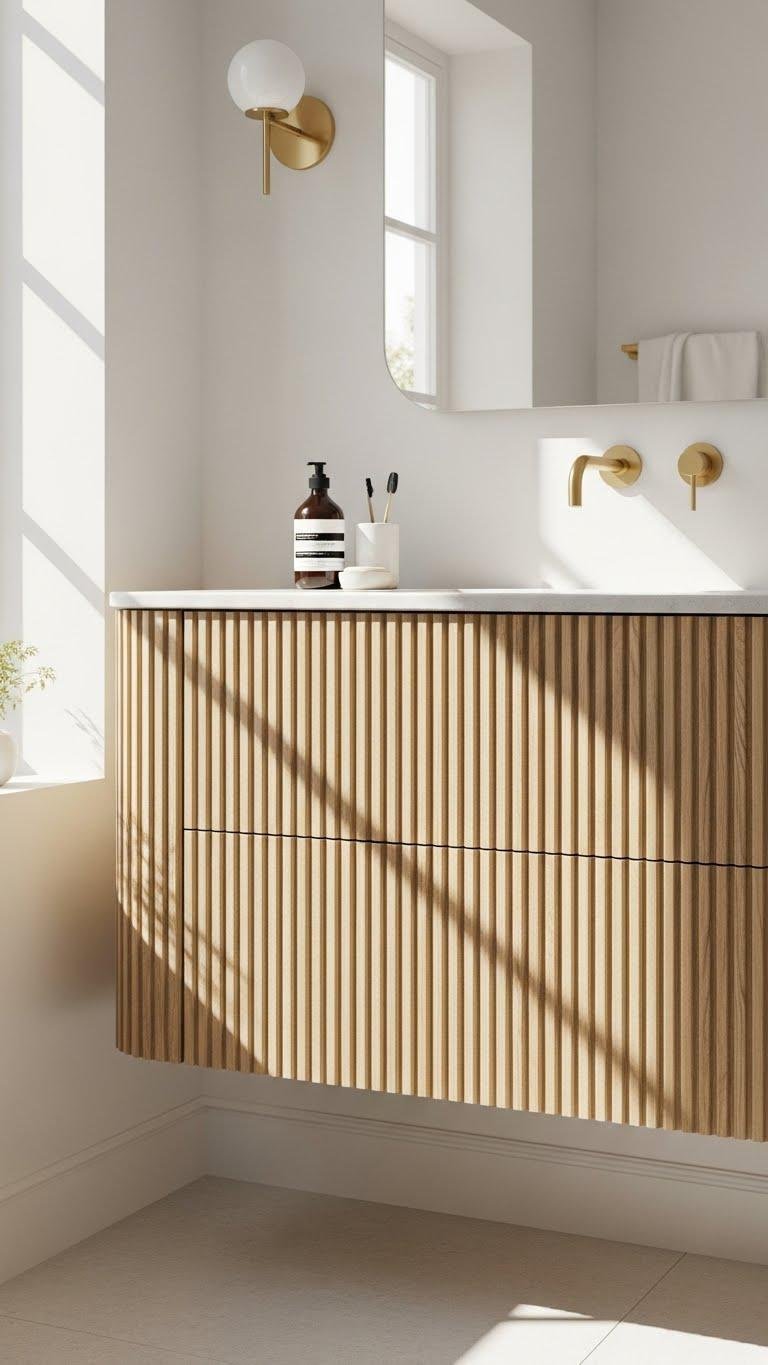Swap in a fluted wood or white oak vanity front to give your bathroom instant texture and modern warmth. Choose curved fluting for soft, rhythmic shadow lines that catch light and free your space from flatness. An oak veneer finish reads luxe without heavy upkeep, letting you customize stain or pale wash. You’ll get a calm, airy focal point that feels effortlessly open.