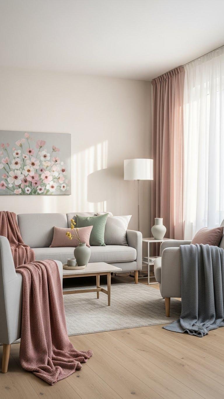 Choose soft neutrals as a base, then layer pastel throws, cushions, and curtains for calm contrast. Add muted florals in artwork or linens, keep lines clean, and swap a few accessories so your space breathes — effortless, liberated, and gently modern.