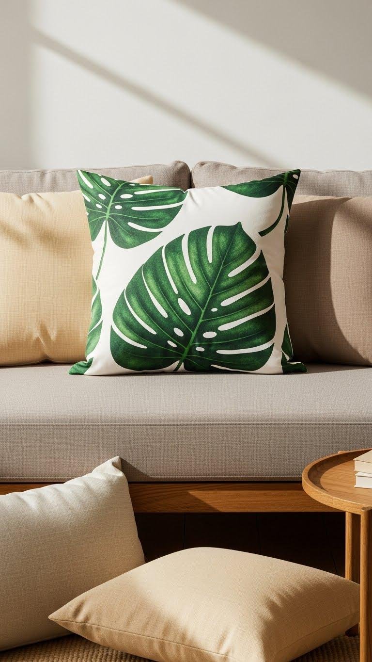 Why not let a single oversized leaf print set the tone of a room? You’ll choose pillows with oversized foliage and consider print scale to balance a minimalist sofa.