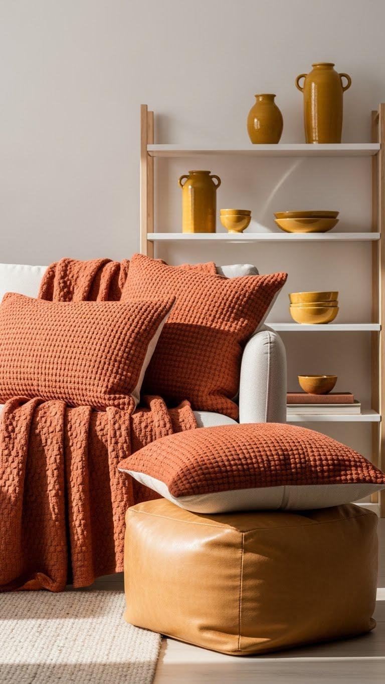 Choose terracotta textiles like throw pillows and lightweight poufs to add texture, and place mustard ceramics—vases or small bowls—on open shelves.