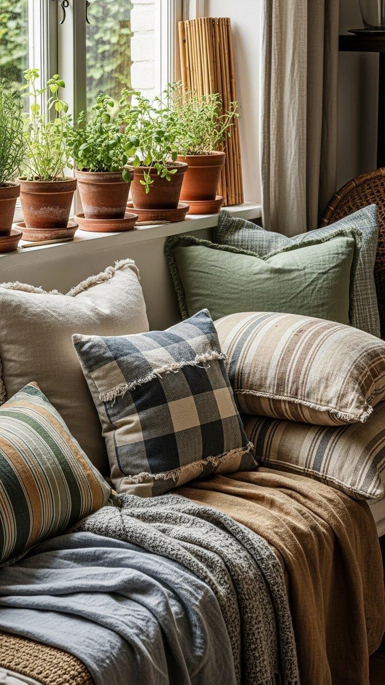 After you’ve lined your windowsill with herbs and natural bamboo textures, bring that same approachable warmth into the rest of the room by layering cozy, lived-in fabrics for a vintage feel. Mix distressed linen throws, pillows with frayed edges, and cushions in vintage ticking or faded stripes. Choose muted palettes, varied textures, and relaxed placement so your space feels lived-in, free, and effortlessly curated.